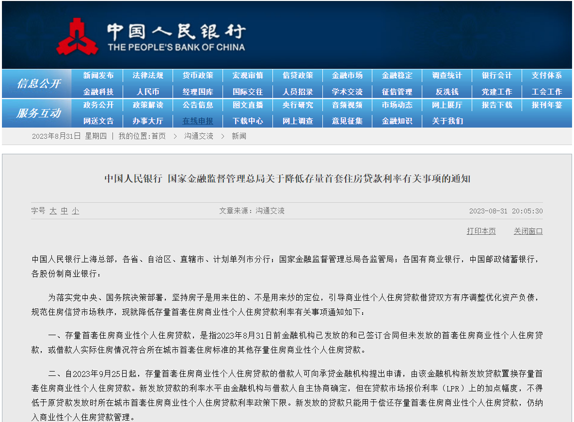 8月31日晚间,为引导商业性个人住房贷款借贷双方有序调整优化资产负债,规范住房信贷市场秩序,中国人民银行、国家金融监督管理总局发布关于降低存量首套住房贷款利率有关事项的通知(以下简称“通知”)。