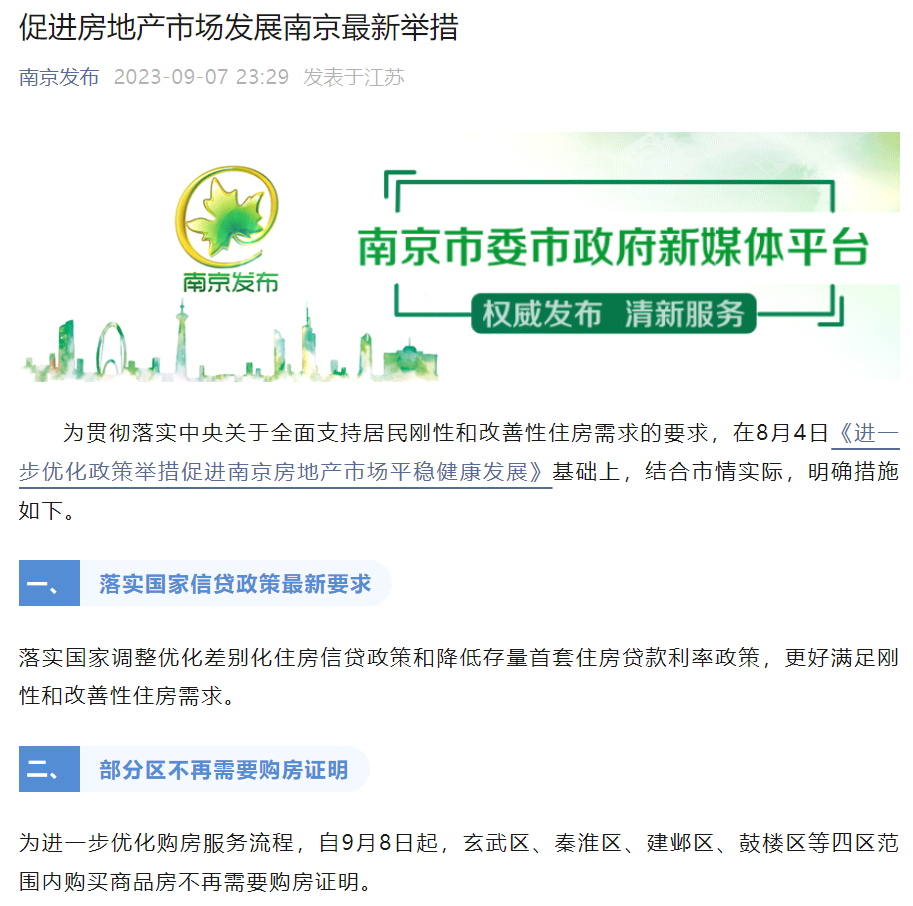 大公房产讯 9月7日晚间,南京市委市政府新媒体平台“南京发布”公众号发文,为贯彻落实中央关于全面支持居民刚性和改善性住房需求的要求,南京方面在8月4日《进一步优化政策举措促进南京房地产市场平稳健康发展》基础上,发布促进房地产市场发展最新举措(以下简称“宁六条”)。