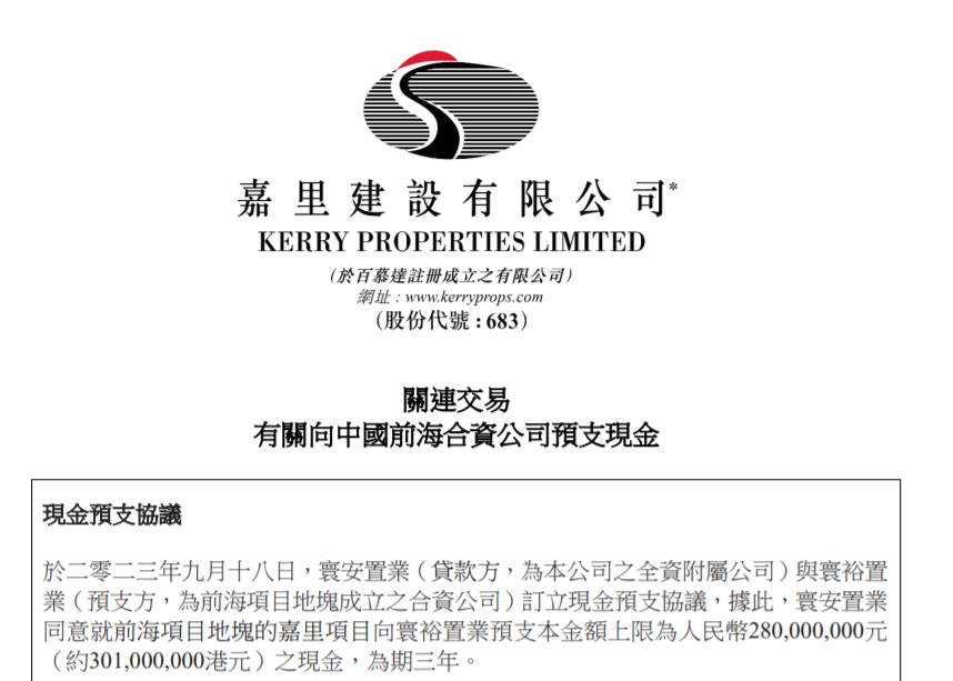 于2023年9月18日,寰安置业(贷款方,为嘉里建设的全资附属公司)与寰裕置业(预支方,为前海项目地块成立之合资公司)订立现金预支协议,据此,寰安置业同意就前海项目地块的嘉里项目向寰裕置业预支本金额上限为2.8亿元现金,为期三年。