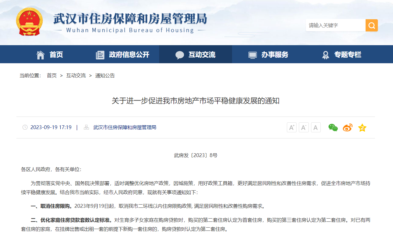 《通知》明确,自2023年9月19日起,取消武汉市二环线以内住房限购政策,满足居民刚性和改善性购房需求。同时,对生育多子女家庭在购房贷款时,购买的第二套住房认定为首套住房,购买的第三套住房认定为第二套住房。对已有两套住房的家庭,在挂牌出售或出租一套的前提下新购一套住房的,购房贷款时认定为第二套住房。