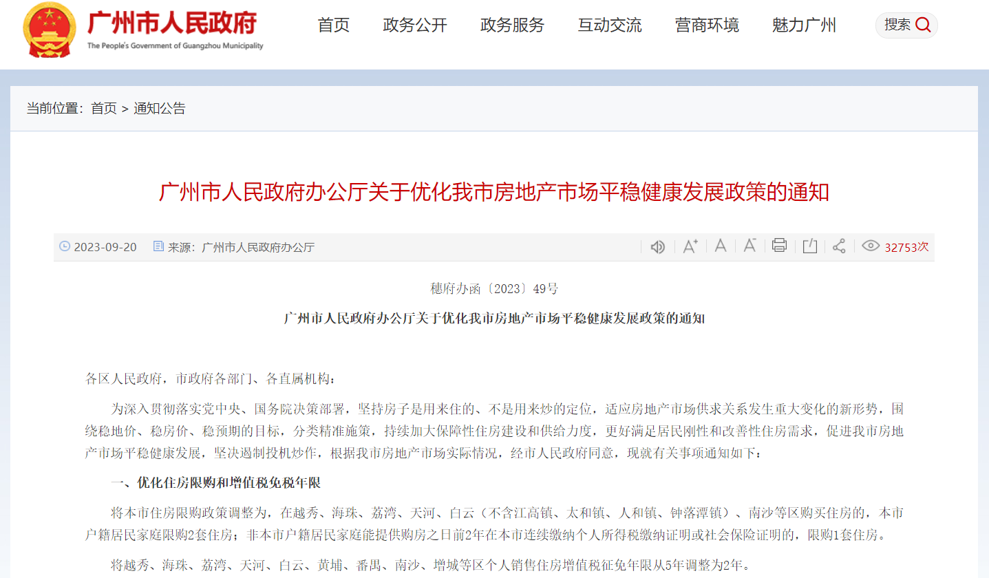 大公房产讯 9月20日,广州市人民政府办公厅发布关于优化我市房地产市场平稳健康发展政策的通知(以下简称《通知》)。