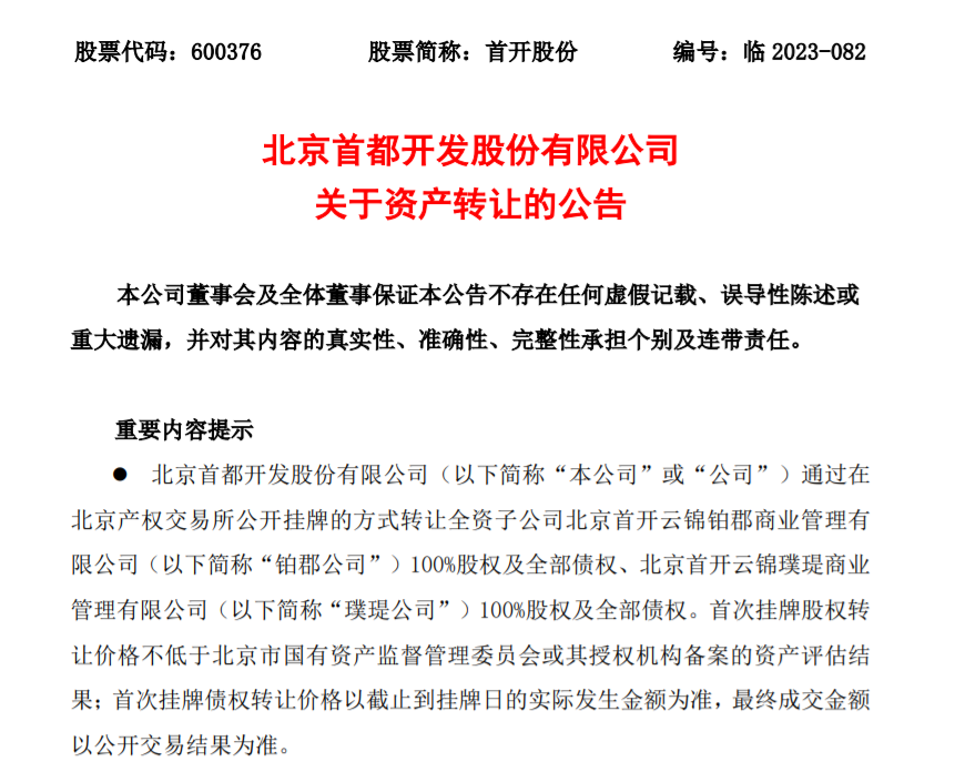 大公房产讯 9月25日,北京首都开发股份有限公司(股票代码:600376,股票简称:首开股份)关于资产转让的公告。
