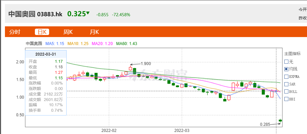 通过东方财富平台可以看到,2022年3月31日,中国奥园收盘价报1.18港元/股。于2023年9月25日复牌首日,该公司股价大幅下跌,盘中最低报0.285港元/港元,最终收盘价为0.325港元/股,跌幅达72.46%,总市值为9.638亿港元。