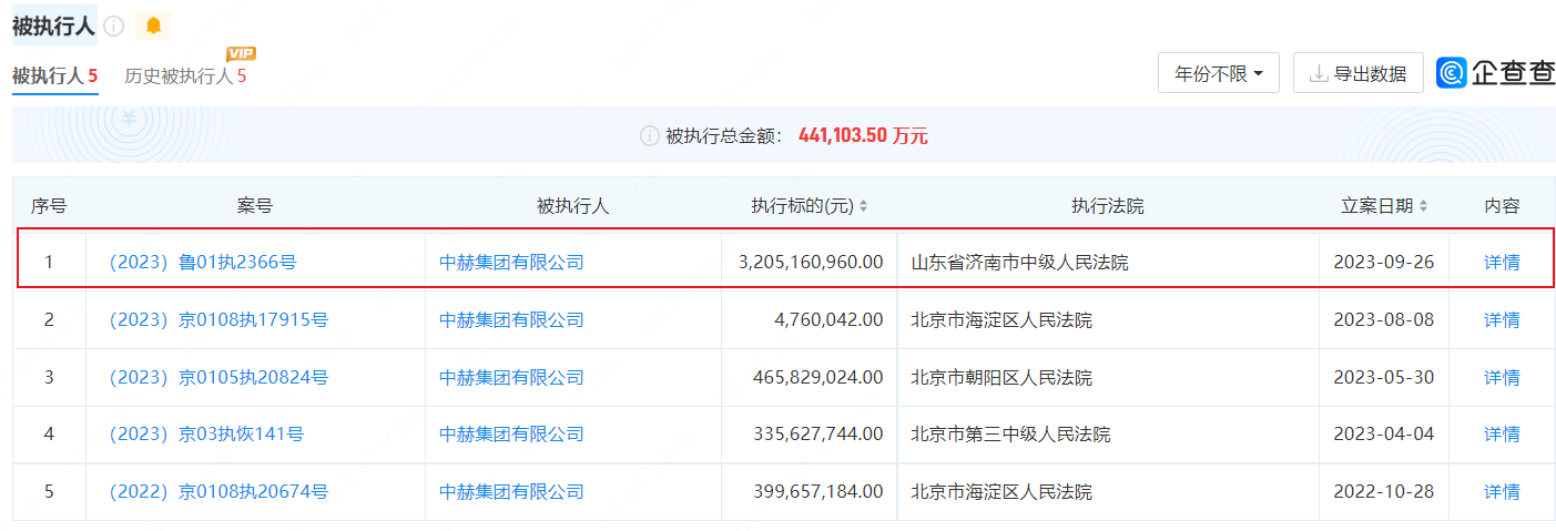大公房产讯 据企查查消息,9月26日,中赫集团新增一条被执行人记录。