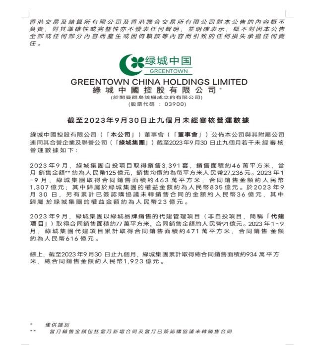 截至2023年9月30日止,绿城中国累计取得总合同销售面积约934万平方米,与去年同期持平,总合同销售金额约人民币1923亿元,同比减少2.3%。