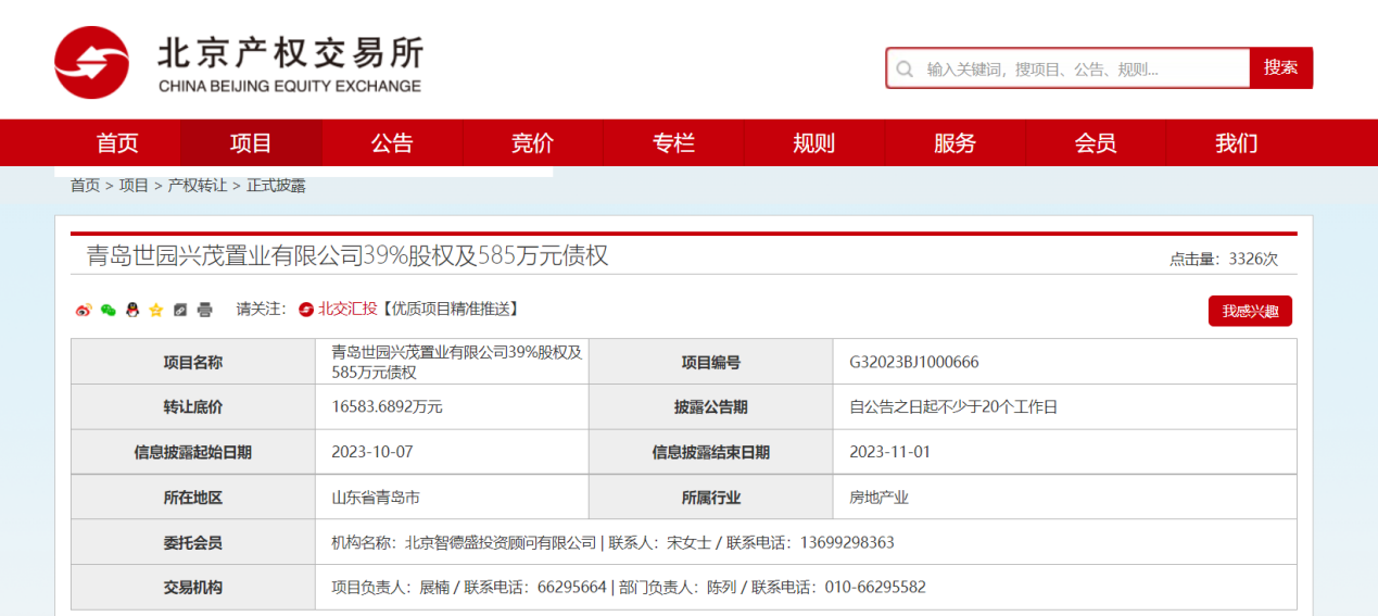 大公房产讯 10月7日,北京产权交易所信息显示,青岛世园兴茂置业有限公司(以下简称“世园兴茂”)39%股权及585万元债权被挂牌转让,转让底价1.66亿元,信息披露起始日期2023年10月7日至2023年11月1日。