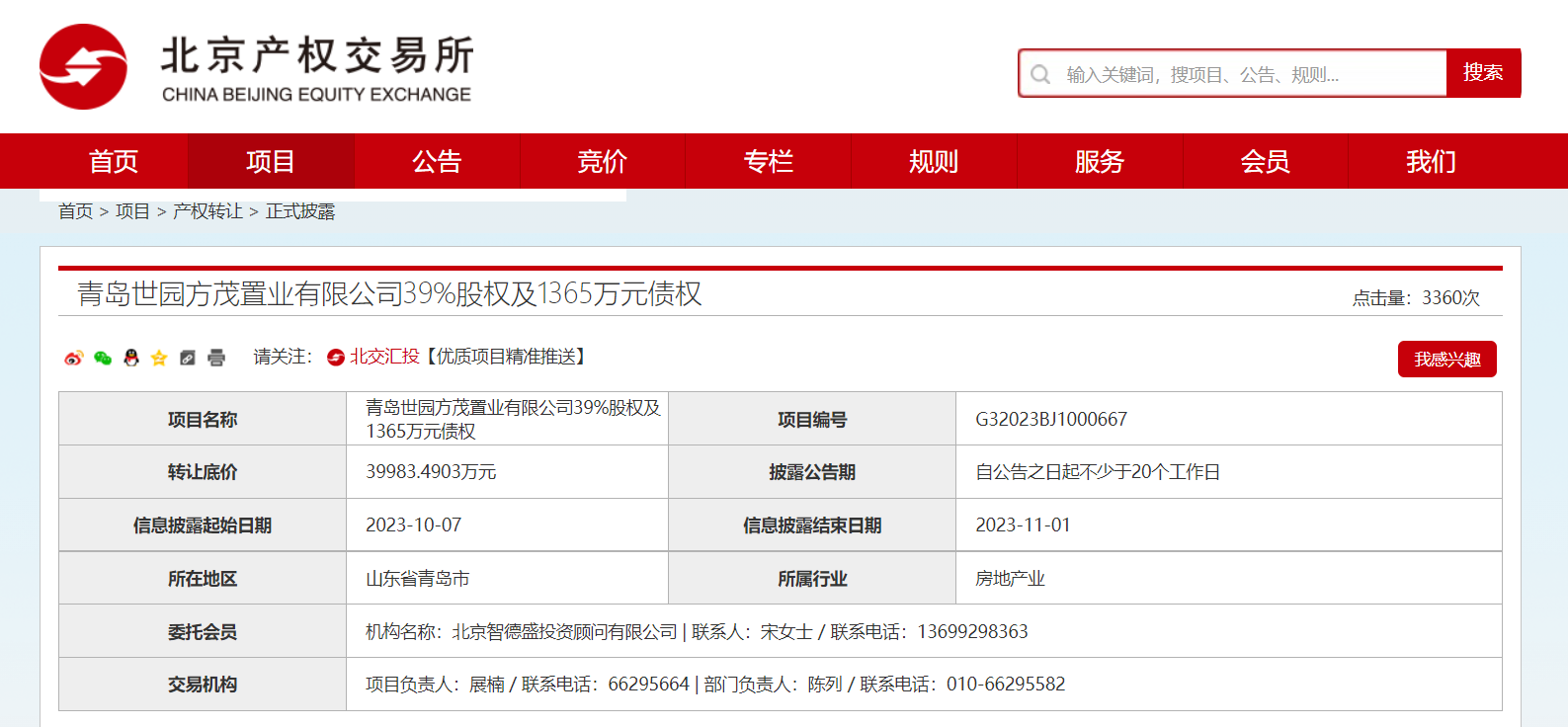 与此同时,青岛世园方茂置业有限公司(以下简称“世园方茂”)39%股权及1365万元债权挂牌转让,转让底价约4亿元,披露结束日期为2023年11月1日,转让方同样为青岛方盛置业有限公司。