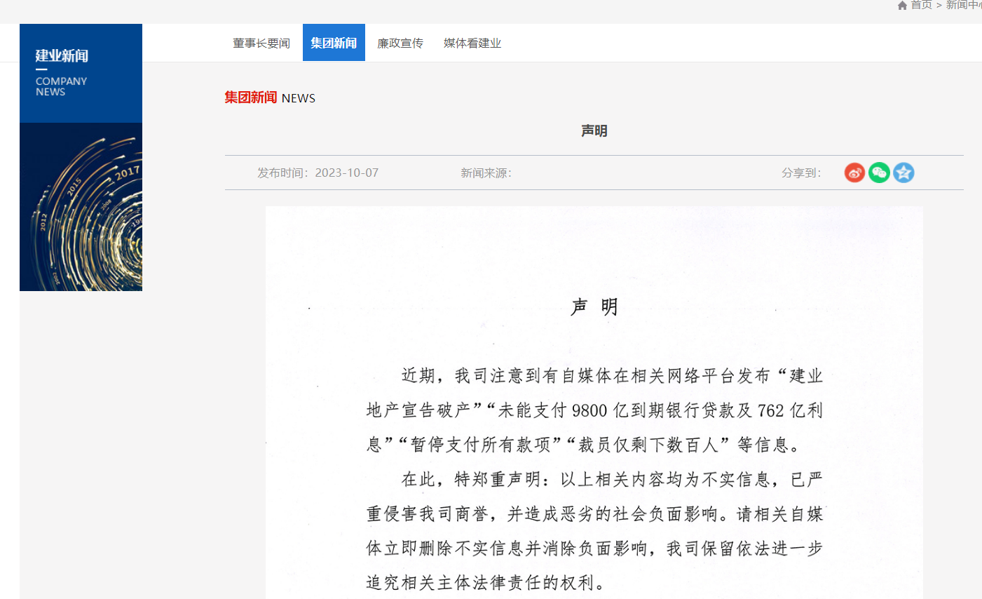 大公房产讯 10月7日晚间,建业集团发布声明称,近期,公司注意到有自媒体在相关网络平台发布“建业地产宣告破产”“未能支付9800亿到期银行贷款及762亿利息”“暂停支付所有款项”“裁员仅剩下数百人”等信息。
