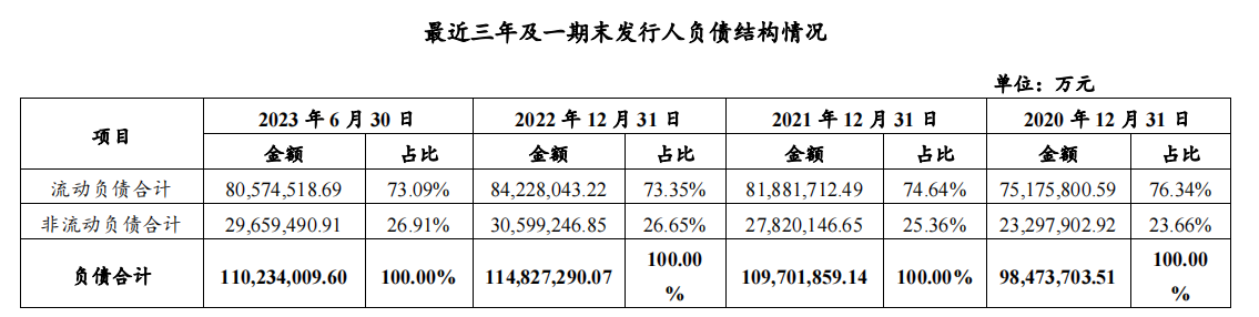 值得注意的是,保利发展债务规模逐步扩大,负债规模也相应扩大。数据显示,自2020年至2022年保利发展负债合计分别为 9847.4亿元、10970.2亿元和11482.7亿元,2023年上半年保利发展负债合计为 11023.4亿元。