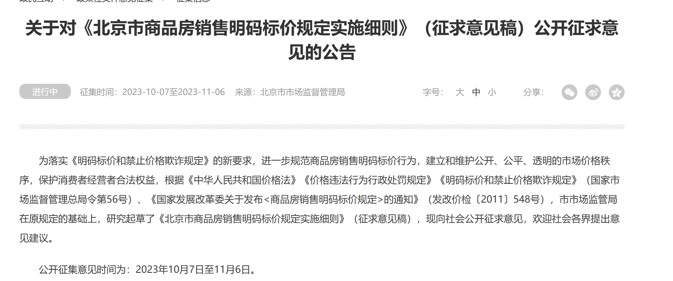 大公房产讯 10月8日,北京市政府官网显示,北京市市场监管局发布《北京市商品房销售明码标价规定实施细则》(征求意见稿)(以下简称《实施细则》)向社会公开征求意见。