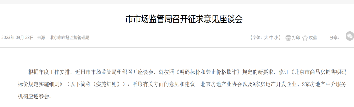 值得一提的是,9月23日,北京市市市场监管局组织召开座谈会,就按照《明码标价和禁止价格欺诈》规定的新要求,修订《实施细则》,听取有关方面的意见和建议。北京房地产业协会以及9家房地产开发企业、2家房地产中介服务机构应邀参会。
