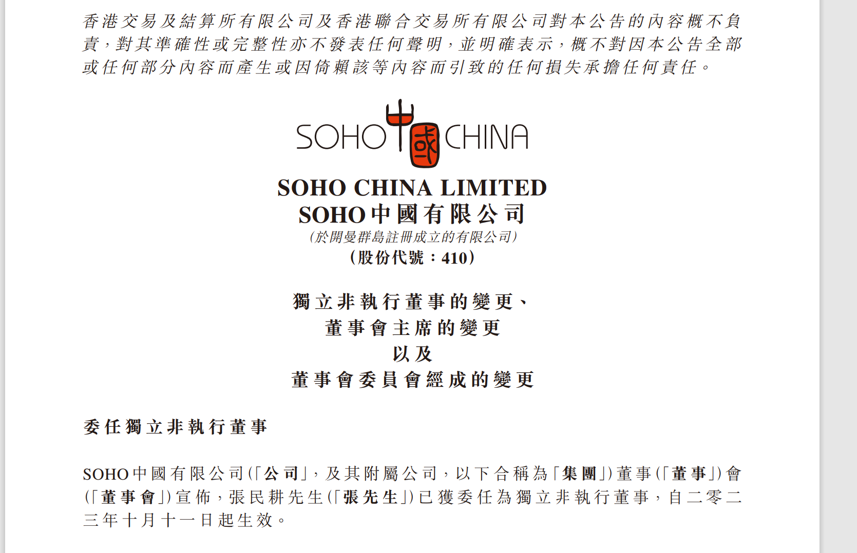 大公房产讯 10月12日,SOHO中国发布有关独立非执行董事的变更、董事会主席的变更以及董事会委员会经成的变更的公告。