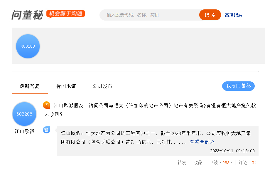 大公房产讯 10月11日,投资者互动平台有投资者向江山欧派提问关于公司与恒大地产的关系以及恒大地产是否有拖欠款未收回的问题。