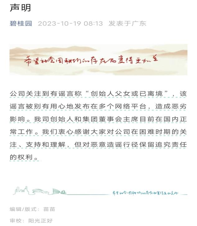 大公房产讯 10月19日,碧桂园官方公众号发布声明显示,公司关注到有谣言称“创始人父女或已离境”,该谣言对公司正常运营发展造成恶劣影响。碧桂园集团表示感谢大家对公司支持和理解,对恶意造谣行径将予以追究。