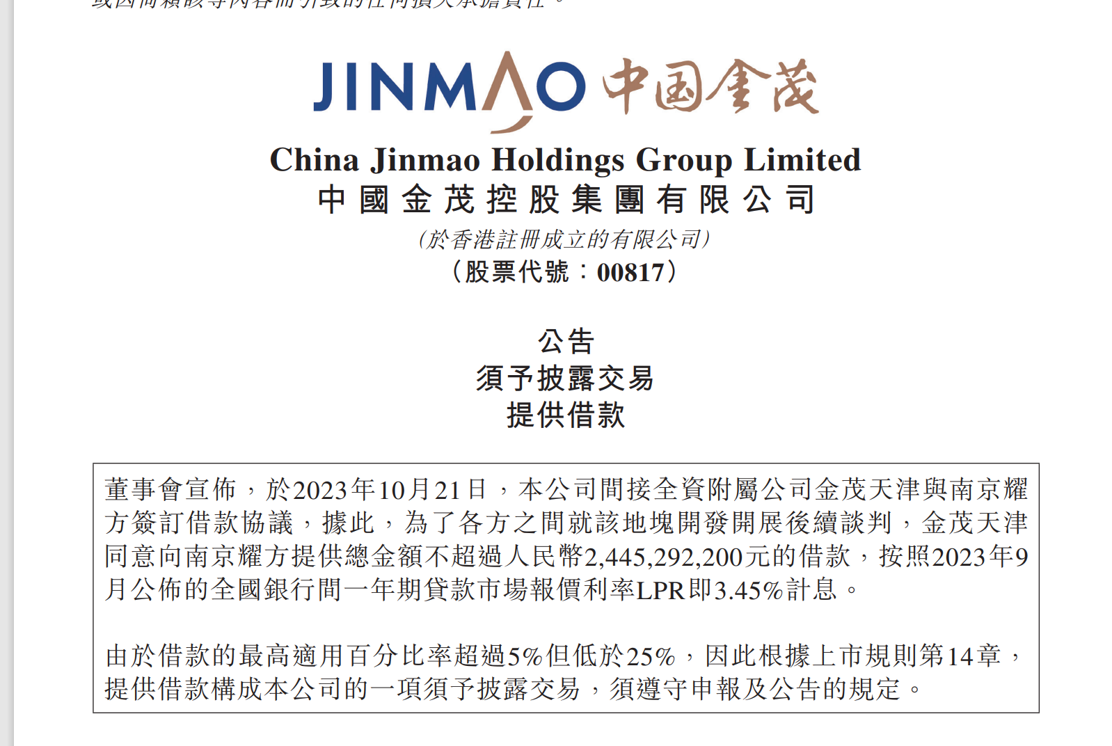 公告显示,2023年10月21日,金茂天津与南京耀方签订借款协议,为了各方之间就江苏省苏州市高新区竹园路绿化地南、大轮浜绿化地西编号为2023-WG-64的地块开发开展后续谈判,金茂天津同意向南京耀方提供总金额不超过24.45亿元的借款,按照2023年9月公布的全国银行间一年期贷款市场报价利率LPR即3.45%计息。