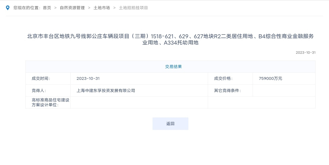 另外一宗地块为丰台区地铁九号线郭公庄车辆段项目(三期)1518-621、629、627地块,紧邻6114等地块。用地性质为R2二类居住用地、B4综合性商业金融服务业用地、A334托幼用地,住宅建筑规模11.15万平方米,另有5.28万平方米商业金服用地及3935平方米托幼用地。该地块挂牌出让起始价为66亿元,中建东孚(八局)、中海、华润、金茂、大悦城、首开6家房企报名参与竞拍,最终由中建东孚以地价上限75.9亿元摇号竞得,溢价率15%,约6.81万元/平方米。