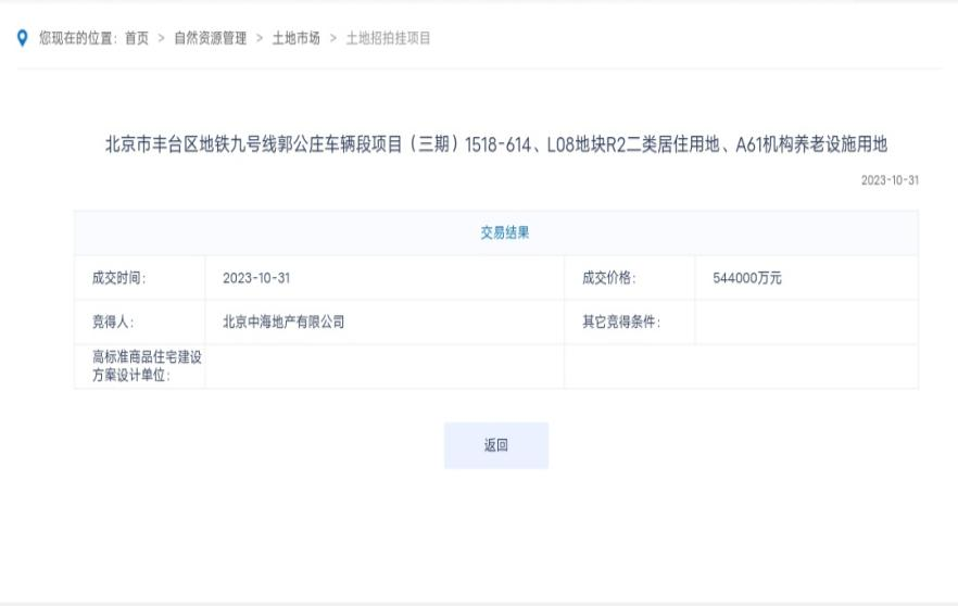 此外,大公房产注意到,10月24日,中海旗下子公司还拿下了北京市丰台区北宫镇辛庄村II区棚户区改造土地开发项目A-05-1、A-06、A-06-1地块R2二类居住用地。出让公告显示,该地块用地规模约10.06万平方米,地上建筑约11.07万平方米,总成交价33.8亿元。