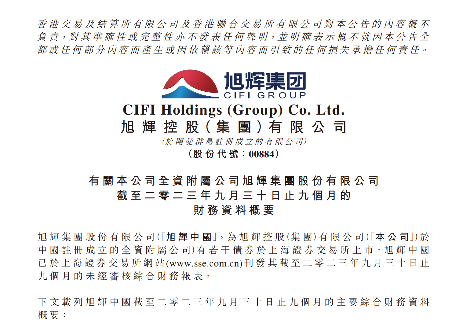 大公房产讯11月1日,旭辉控股发布公告,披露了有关公司全资附属公司旭辉集团股份有限公司(以下简称旭辉中国)截至2023年9月30日止九个月的财务资料概要。