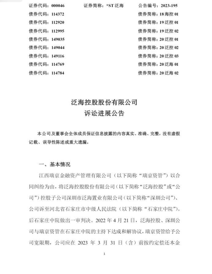 2022年4月21日,泛海控股、深圳公司与瑞京资管在石家庄中院的主持下达成和解协议,瑞京资管给予公司宽限期。深圳公司应在2023年3月31日(含)前按约定偿还本金约2.05亿元及违约金。但由于公司未能完成上述债务的偿付,深圳公司及泛海控股被石家庄中院强制执行。
