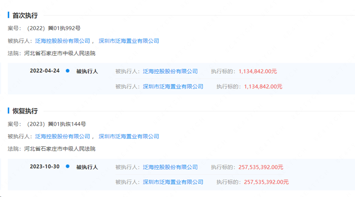此外,大公房产注意到,2023年10月30日,泛海控股股份有限公司、深圳市泛海置业有限公司新增一则恢复执行信息,执行标的约2.575亿元,关联案件为上述合同纠纷,执行法院为石家庄市中级人民法院。