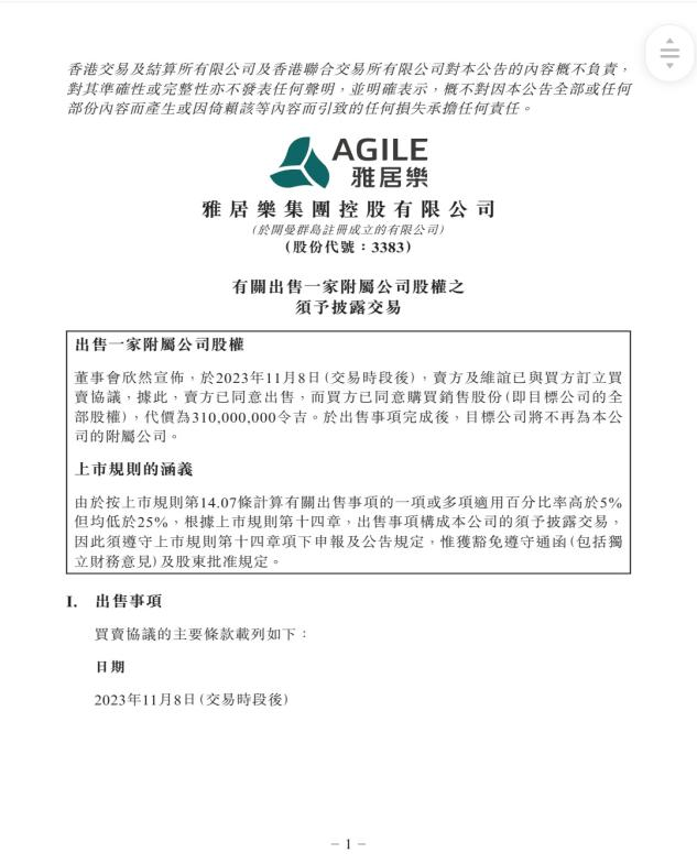 大公房产讯 11月8日,雅居乐集团发布公告称,于2023年11月8日(交易时段后),AREDSB及DHSB作为卖方与Law Developments Sdn Bhd(作为买方)已订立买卖协议,前者同意出售其在马来西亚一家住宅项目公司的全部股权,代价为3.1亿令吉(约合6620万美元)。