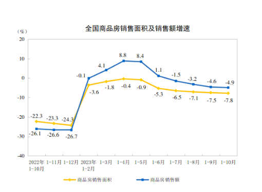 对此,中指研究院市场研究总监陈文静表示,从销售表现来看,受房价下跌预期、居民收入预期偏弱等因素影响,短期市场修复持续性略显不足。1-10月,全国商品房销售面积、销售金额累计值降幅有所扩大。