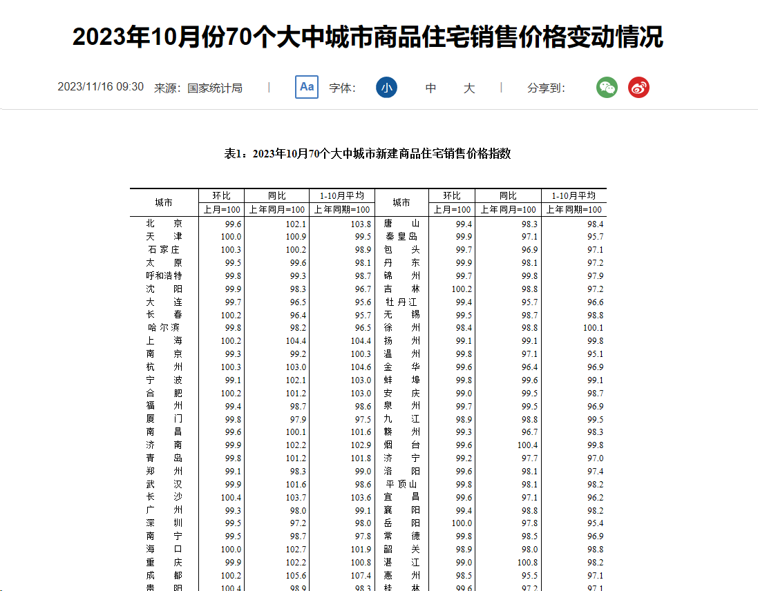 大公房产讯 11月16日,国家统计局发布2023年10月份商品住宅销售价格变动情况统计数据。