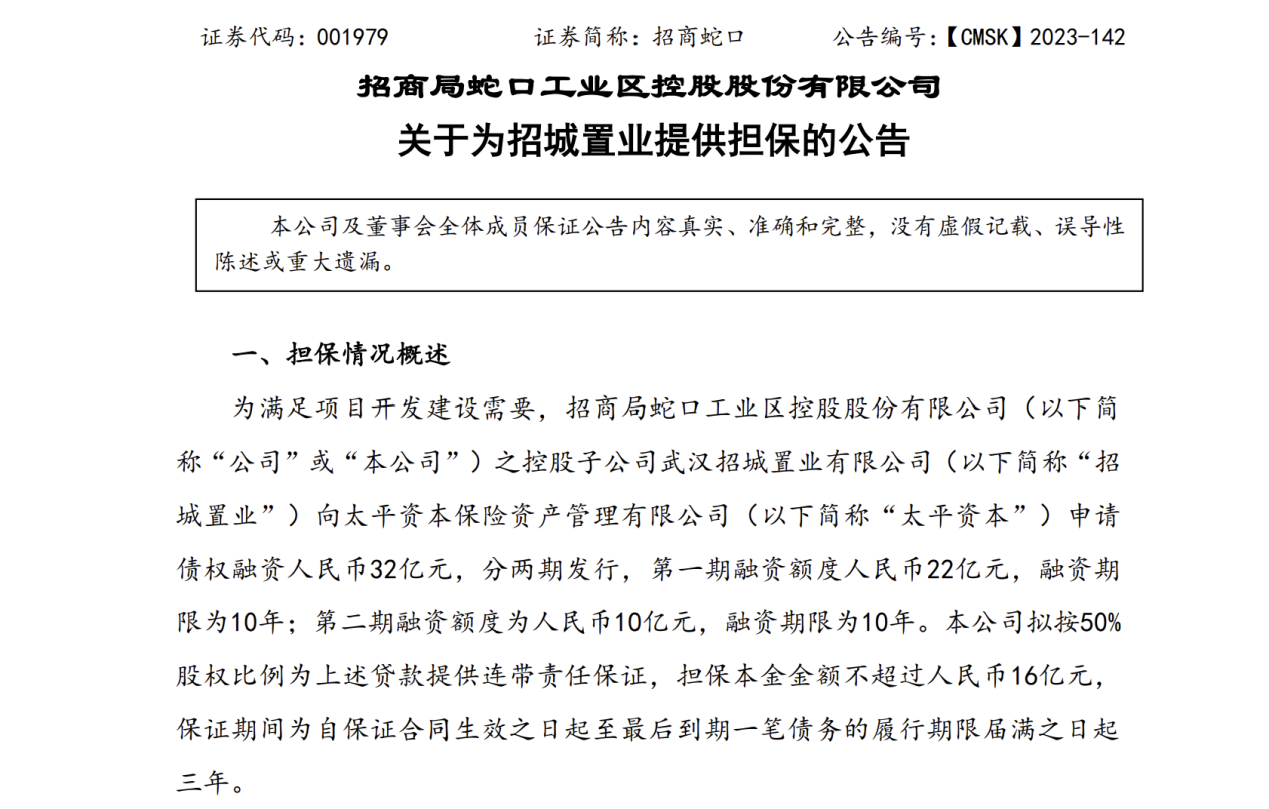 于11月22日,招商蛇口再次发布公告称,为满足项目建设需要,公司全资子公司招商苏州为苏州招华提供不超过12亿元连带责任担保,保证期间为自合同生效之日起至全部债务履行期限届满之日起三年;招商蛇口全资子公司深圳招商为长沙招添提供不超过6.3亿元连带责任担保,保证期间为自担保合同生效之日起至债务到期之日起另加三年。