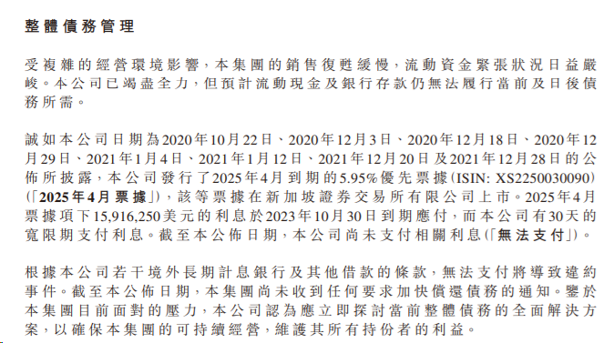 在公告中,宝龙地产还提到,受复杂的经营环境影响,集团的销售复苏缓慢,流动资金紧张状况日益严峻。公司已竭尽全力,但预计流动现金及银行存款仍无法履行当前及日后债务所需。