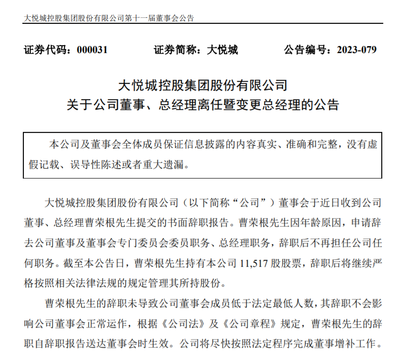 大公房产讯 近日,大悦城发布公告宣布,公司今日收到董事、总经理曹荣根提交的书面辞职报告。曹荣根因年龄原因,申请辞去公司董事及董事会专门委员会委员职务、总经理职务,辞职后不再担任公司任何职务。
