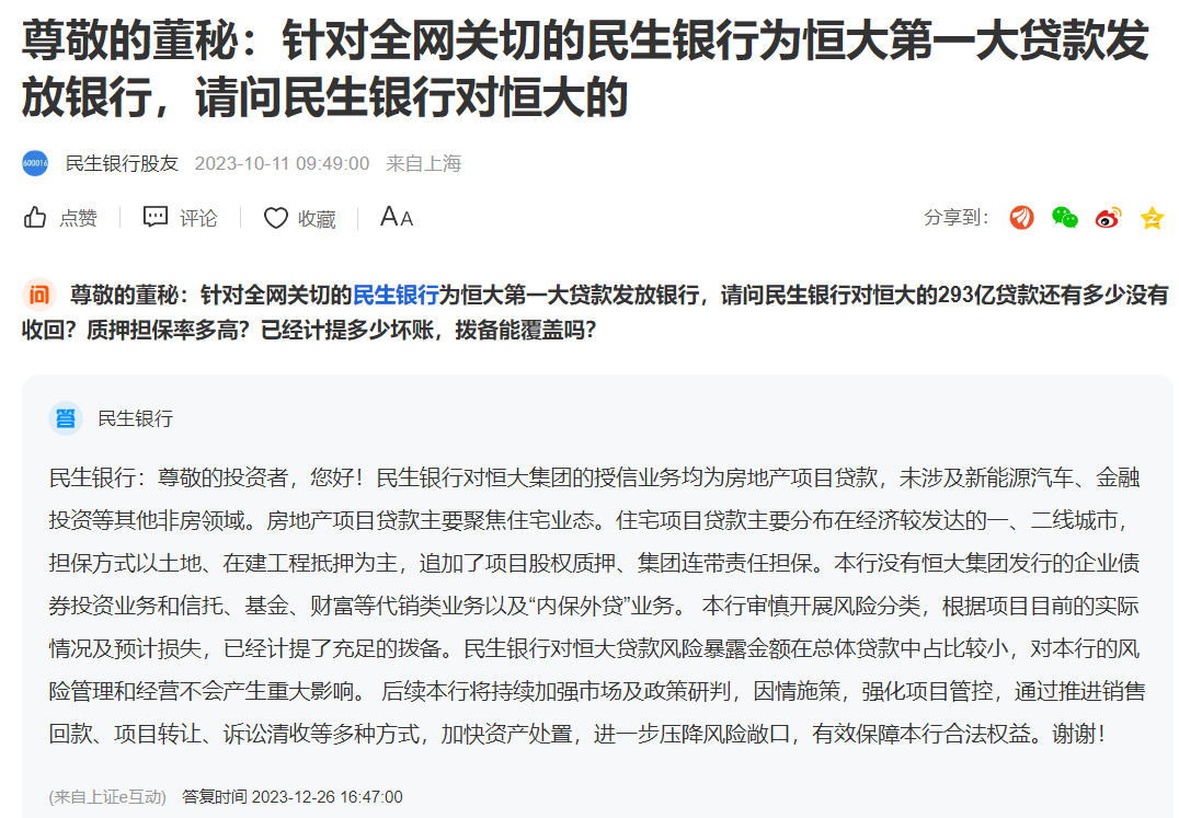 大公房产讯 据上证e互动消息,12月26日,中国民生银行在投资者互动平台就“民生银行为恒大第一大贷款发放银行”相关问题做出回复。