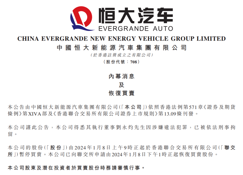 大公房产讯 1月8日,恒大系上市公司恒大汽车发布内幕消息。据悉,恒大汽车执行董事刘永灼因涉嫌违法犯罪,已被依法刑事拘留。