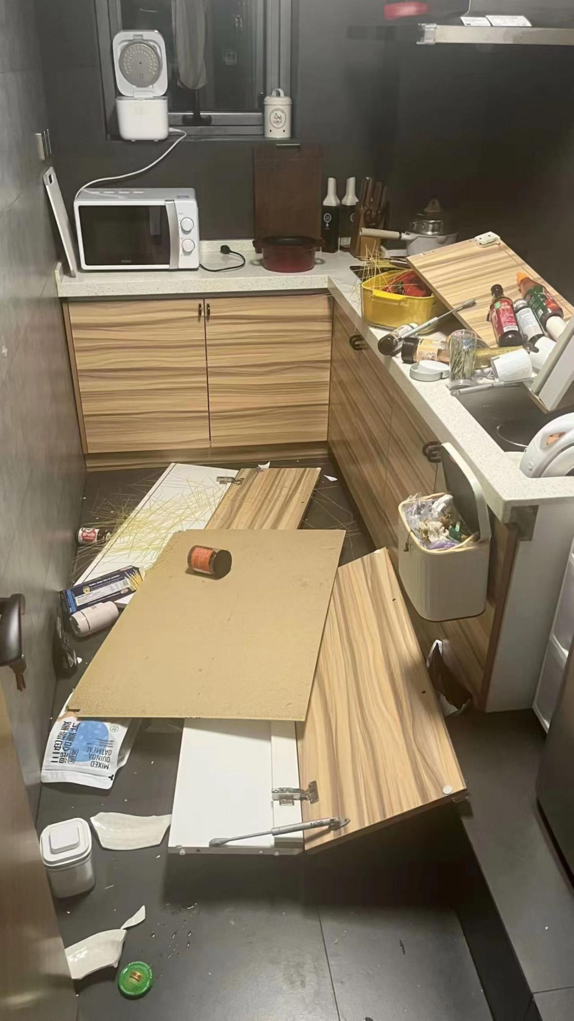 据王女士提供的图片显示,橱柜已经大面积散落下来,厨房里的多数物品也遭受到不同程度的损坏。