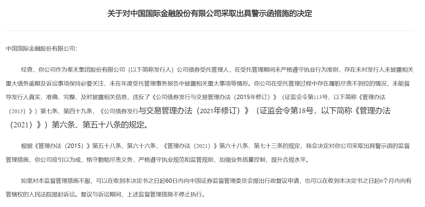 经查,该公司作为泰禾集团股份有限公司(以下简称“发行人”)公司债券受托管理人,在受托管理期间未严格遵守执业行为准则,存在未对发行人未披露相关重大债务逾期及诉讼事项保持必要关注、未在年度受托管理事务报告中披露相关重大事项等情形。公司在受托管理过程中存在履职尽责不到位的情况,未能督导发行人真实、准确、完整、及时披露相关信息,违反了《公司债券发行与交易管理办法(2015年修订)》《公司债券发行与交易管理办法(2021年修订)》。证监会决定对中金公司采取出具警示函的监督管理措施。