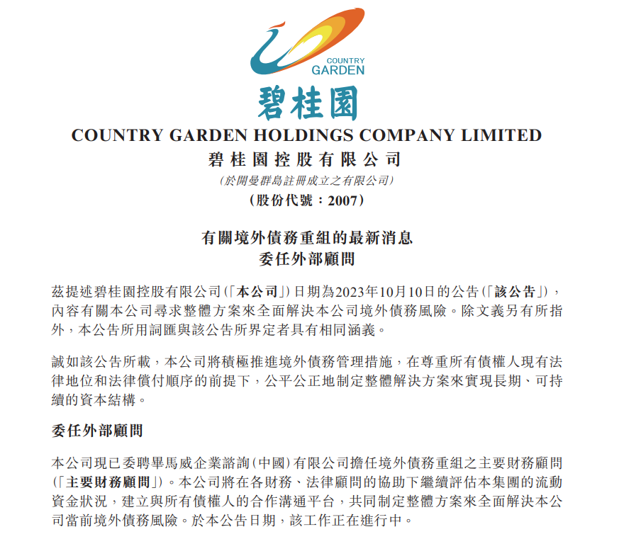 与此同时,碧桂园在公告中重申,有决心推进一个能够确保本集团的长远发展,维护所有利益相关者的权益,并确保公平对待所有债权人的全面解决方案。在进行境外债务重组的过程中,本集团将坚持不懈地保交付、保运营。本公司期待与债权人进行沟通和合作,并呼吁债权人给予耐心、理解和支持,与本公司共同制定解决方案,以克服本公司面临的挑战。