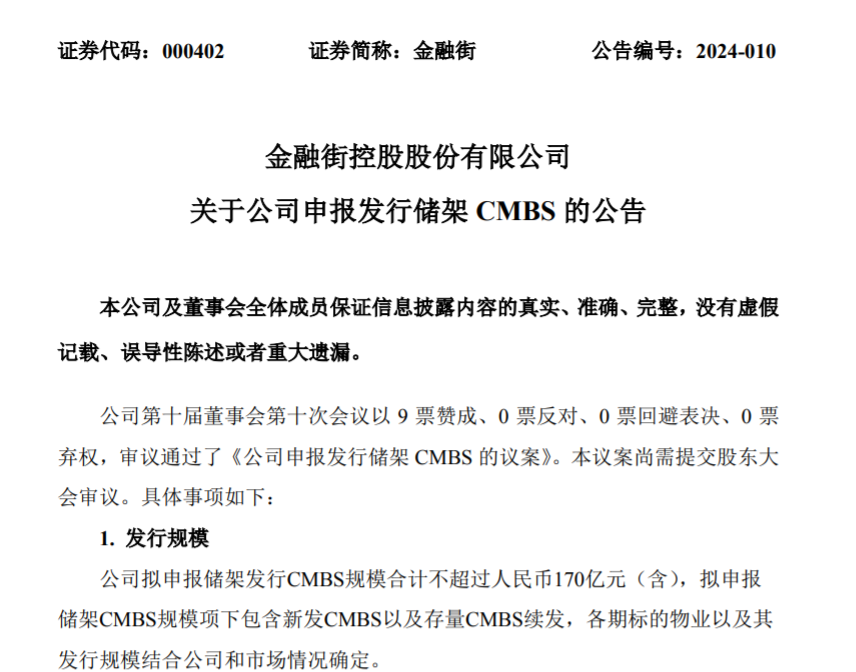 大公房产讯 1月24日,金融街发布公告称,公司拟申报储架发行CMBS(商业房地产抵押贷款支持证券)规模合计不超过人民币170亿元(含),拟申报储架CMBS规模项下包含新发CMBS以及存量CMBS续发,各期标的物业以及其发行规模结合公司和市场情况确定。