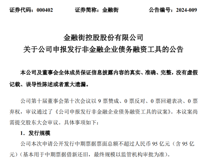 同日,金融街还发布公告宣布,公司第十届董事会第十次会议审议通过了《公司申报发行非金融企业债务融资工具的议案》。根据议案,公司本次申请公开发行中期票据票面总额不超过人民币95亿元(含95亿元)(基本用于中期票据借新还旧,最终规模以监管机构审批为准)。