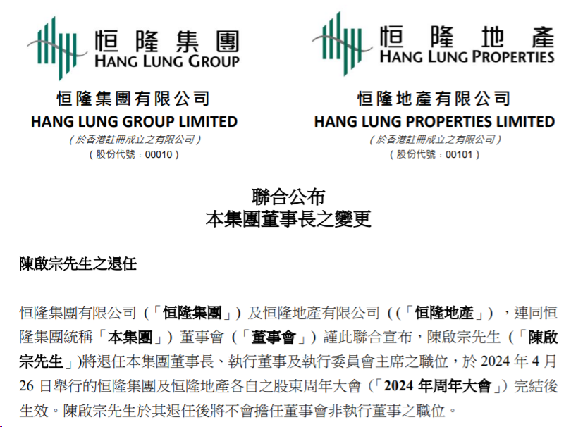 公告显示,陈启宗将退任恒隆集团董事长、执行董事及执行委员会主席职位,于2024年4月26日举行的恒隆集团及恒隆地产各自股东周年大会完结后生效。陈启宗于其退任后将不会担任董事会非执行董事职位。