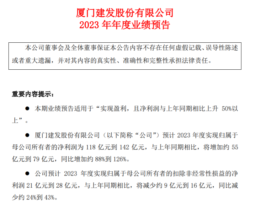 大公房产讯 1月31日,厦门建发股份有限公司(股票代码:600153,股票简称:建发股份)2023年年度业绩预告。