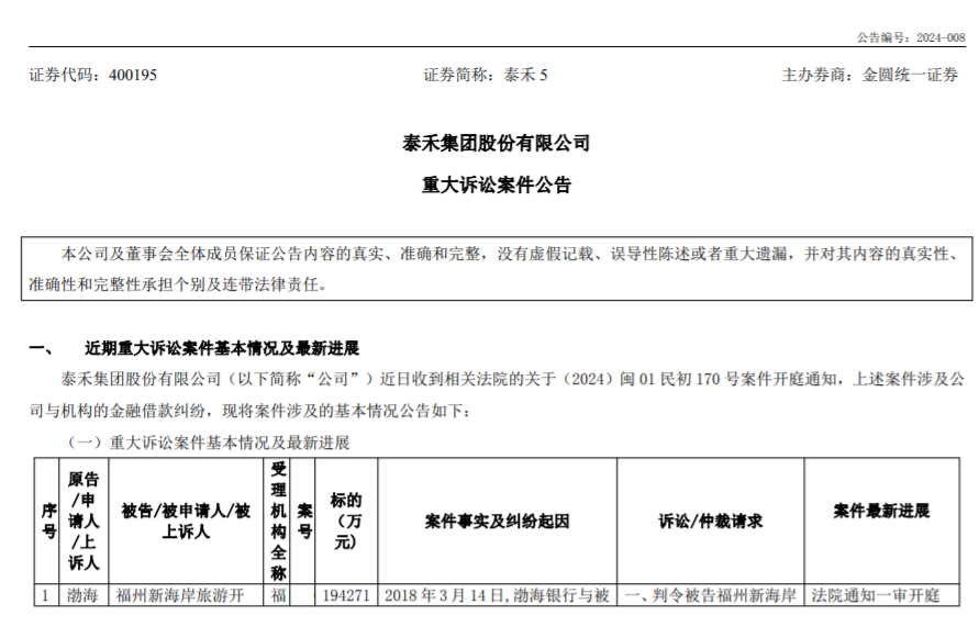 根据公告,该案件原告为渤海银行股份有限公司福州分行,被告为福州新海岸旅游开发有限公司(以下简称”新海岸公司“)、泰禾集团股份有限公司、黄其森、叶荔,涉案标的约19.43亿元。