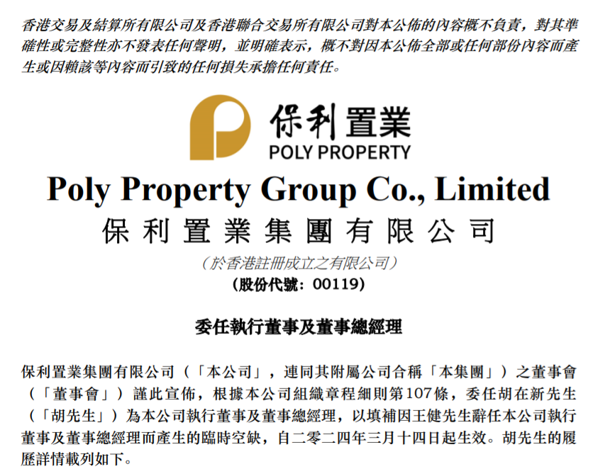 大公房产讯 3月14日,保利置业发布公告称,委任胡在新为本公司执行董事及董事总经理,以填补因王健辞任本公司执行董事及董事总经理而产生的临时空缺,自2024年3月14日起生效。