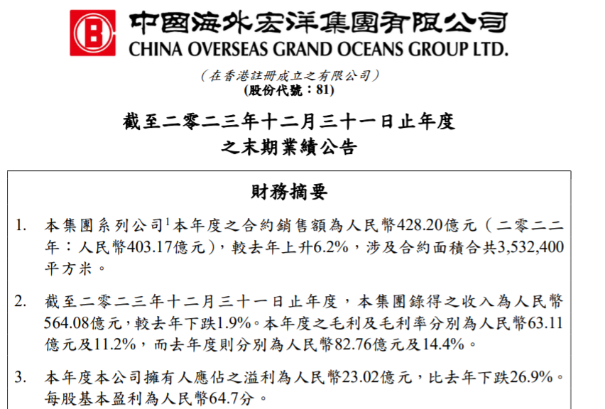 大公房产讯 3月25日,中国海外宏洋集团有限公司(HK00081)发布截至2023年12月31日止年度之末期业绩公告。