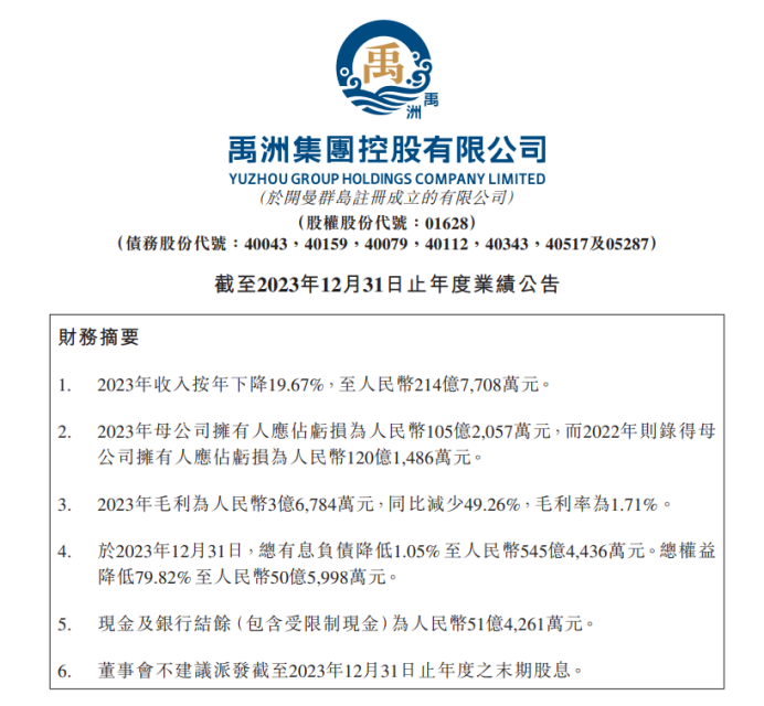 2023年,禹洲集团实现营业收入214.77亿元,同比减少19.67%;母公司拥有人应占亏损为105.21亿元。毛利为3.68亿元,同比减少49.26%,毛利率为1.71%。