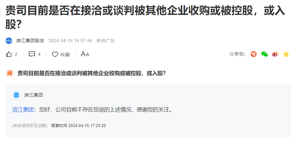 此外,于4月15日,滨江集团针对深交所互动易平台投资者提出的“目前是否在接洽或谈判被其他企业收购或被控股、或入股”,该公司回复称“公司目前不存在上述情况”。