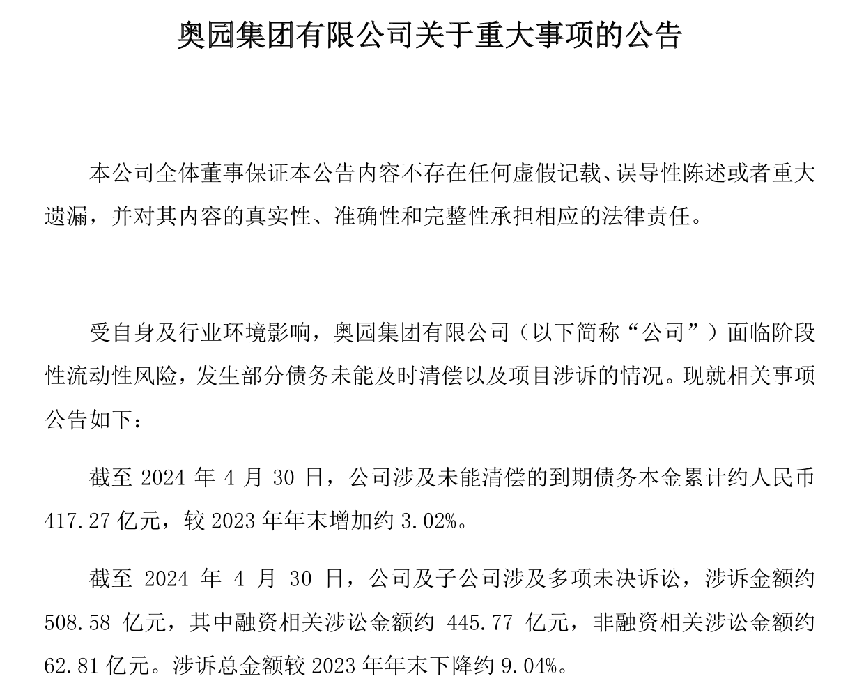 截至2024年4月30日,奥园集团涉及未能清偿的到期债务本金累计约417.27亿元,较2023年年末增加约3.02%。期内,奥园集团及其子公司涉及多项未决诉讼,涉诉金额约508.58亿元,其中融资相关涉讼金额约445.77亿元,非融资相关涉讼金额约62.81亿元,涉诉总金额较2023年年末下降约9.04%。