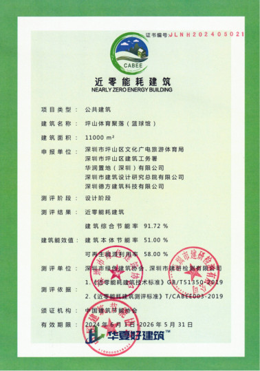 近日,由华润置地代建的坪山体育聚落(篮球馆)项目获得中国建筑节能协会颁发的“近零能耗建筑”设计认证,成为深圳市首个通过近零能耗设计认证的体育场馆项目。经专业机构评测,该项目建筑本体节能率达51%,可再生能源利用率58%,综合节能率高达91.72%,节能降碳效果处于国内同类建筑领先地位。