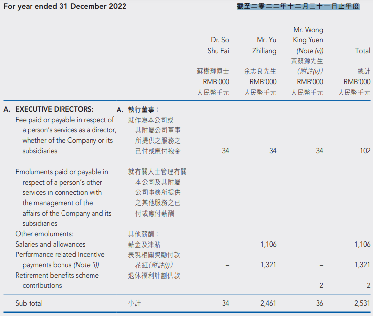 根据2023年年报,执行董事苏树辉、余志良、黄竞源以及陈燕的薪酬分别为3.6万元、85.5万元、2.8万元以及113.7万元,合计共205.6万元。而截至2022年12月31日止年度,执行董事苏树辉、余志良以及黄竞源的薪酬分别为3.4万元、246.1万元以及3.6万元,合计共253.1万元。