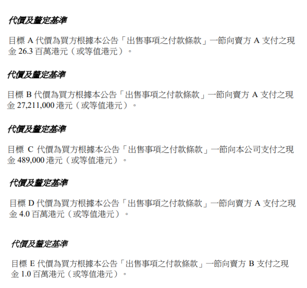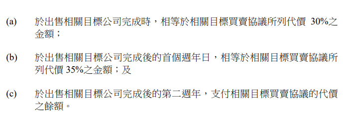 于出售相关目标公司完成时,AC Group Linmited将向新世界发展支付相等于相关目标买卖协议所列代价30%的金额;于出售相关目标公司完成后的首个周年日,相等于相关目标买卖协议所列代价35%之金额;及于出售相关目标公司完成后的第二周年,支付相关目标买卖协议的代价的余额。