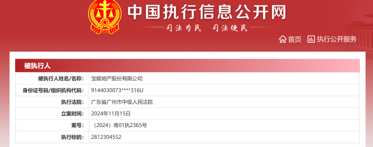 大公房产讯 11月18日,中国执行信息公开显示,宝能地产股份有限公司(以下简称“宝能地产”)新增一条被执行人信息。