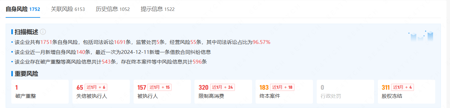 企查查风险数据提示,截至12月12日,奥园集团涉及的司法诉讼案件已累计达到1691条,其中被执行人记录为157条,限制高消费记录更是高达320条。此外,公司还存在破产重整记录,以及多条终本案件和股权冻结等风险信息。